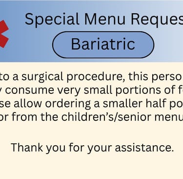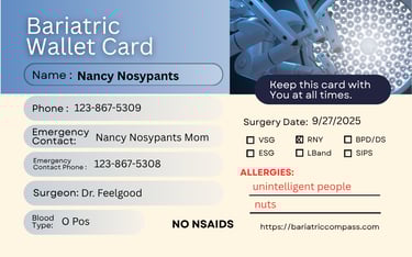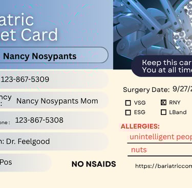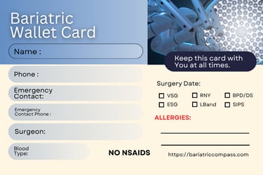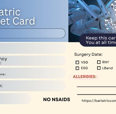 A must-have for bariatric surgery patients! This convenient, wallet-sized card ensures that your critical medical information is always on hand. Crafted from durable card stock with included lamination and available in an easy-to-read format, the card fits perfectly in any wallet. On the back is a Special Menu Request Card that you can show at restaurants that participate in accommodating medical needs.